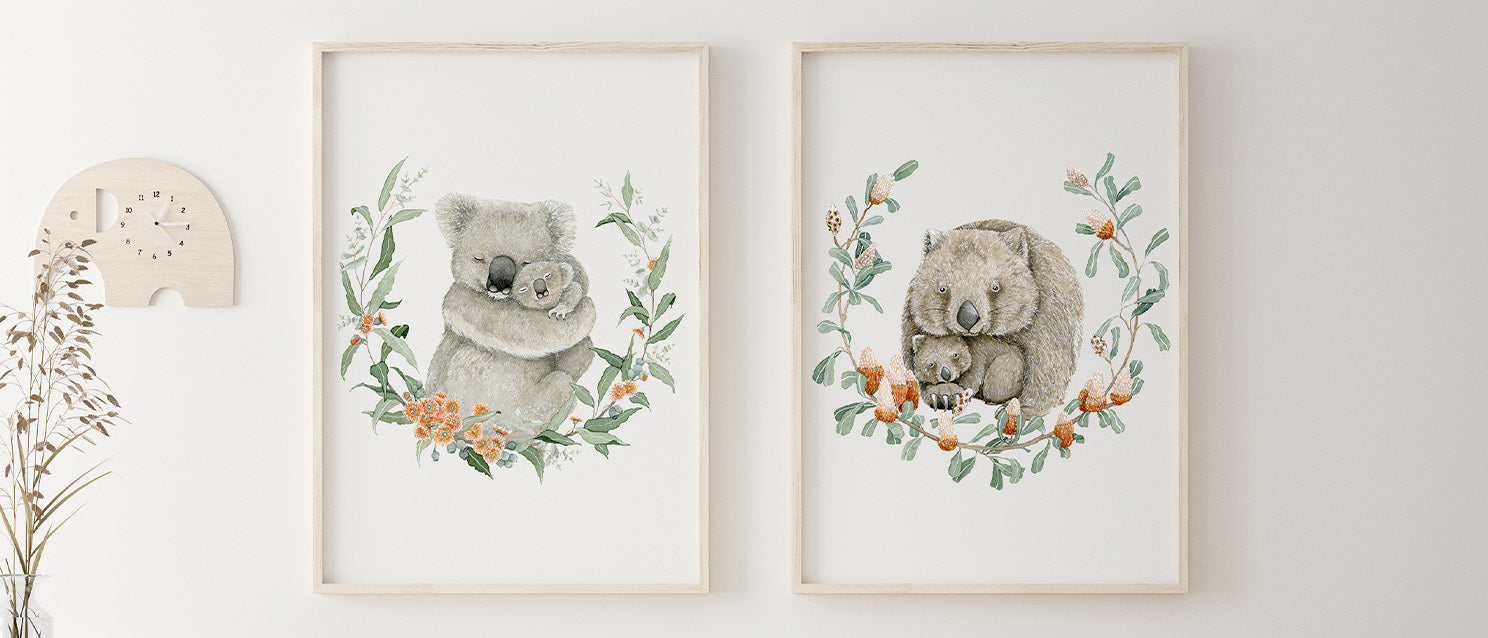 Embrace this adorable collection of Australian animals for a gender neutral nursery and kids room. Hand painted by Jay Young in soft natural tones, these art prints are sure to make your little ones bedroom a calming space to relax in.