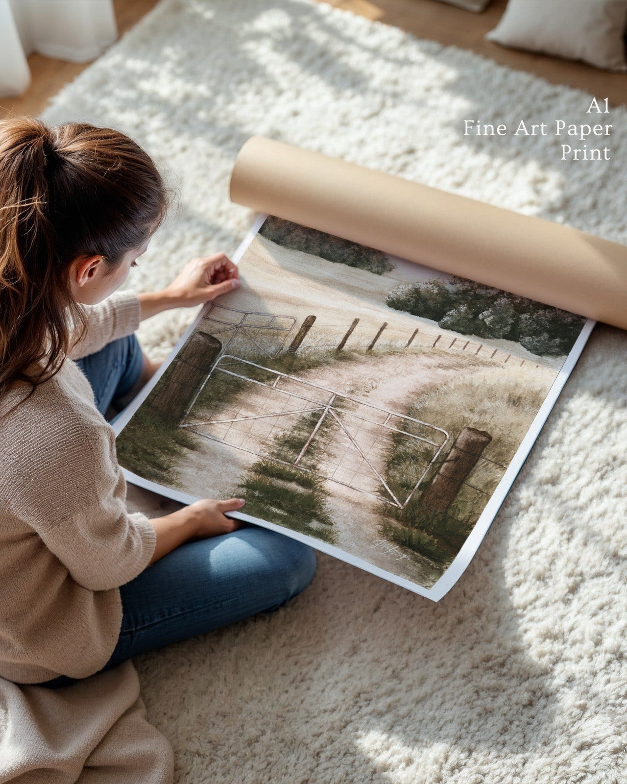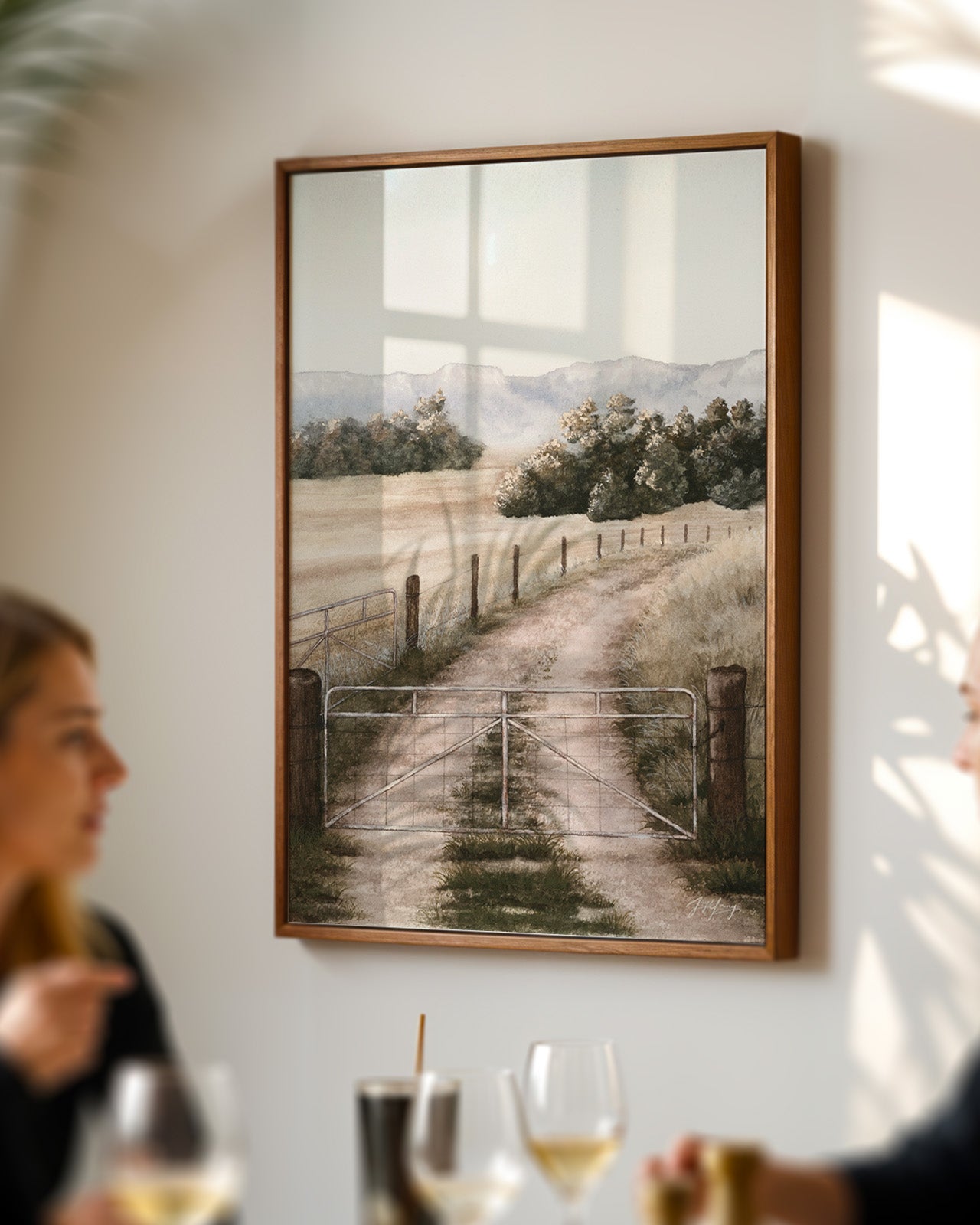 Painted in watercolours with earthy, neutral shades, this Australian landscape print brings the peaceful charm of rural life into your home. Perfect for modern country and rustic interiors, it’s a piece that adds both warmth and serenity to any space.